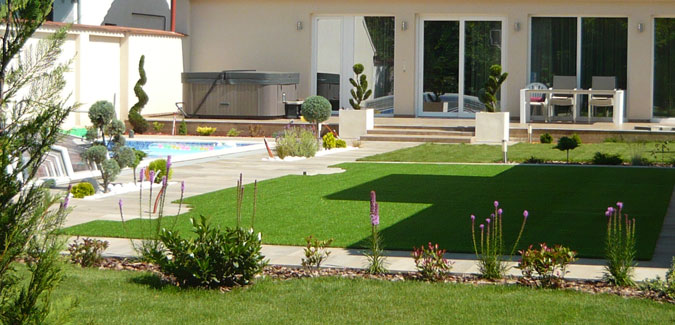 Keskeny és hosszúkás kert esetén törekedtem a tér megnövelését célzó elemek felhasználására. Tompítottam a kiszögeléseket, nagyelemes térkövet választottunk, világos színű, az épület színárnyalatát követő színeket választottunk a megbízóval...